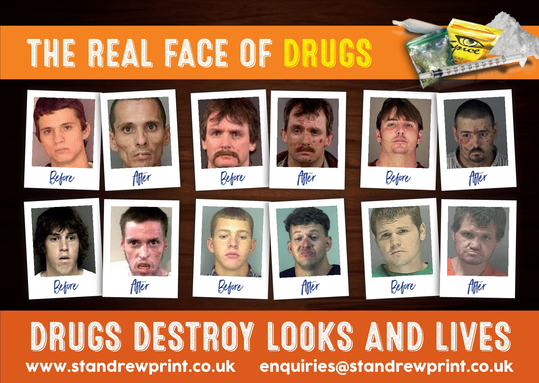 The first kind contains only facial images of 8 females and 8 males. Each face has before and after images, with some only a couple of years apart, and show the devastating effect drugs can have on your facial features, with some being unrecognisable. This card is mainly being used in primary schools.