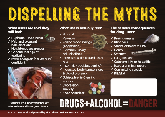 The second design is aimed at audiences of secondary schools, colleges and universities. Although this card has similarity to the first card, with before and after images of some drug users, on the reverse we have added a design, called DISPELLING THE MYTHS.